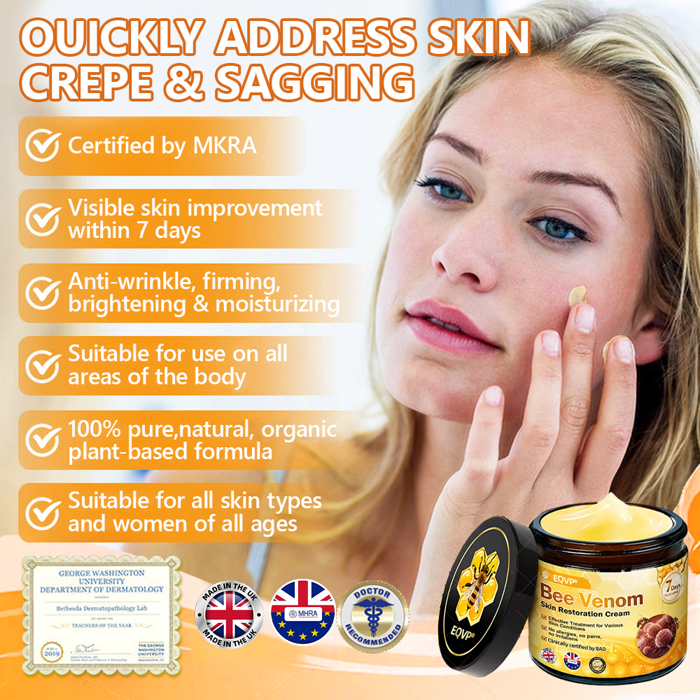 Endorsed by Dr. Grace Ellington, a board-certified dermatologistย with overย 10 years of expertise in skincare, EQVPยฎ ๐˜ฝ๐™€๐™€ ๐™‘๐™€๐™‰๐™Š๐™ˆย Skin Restoration Creamย comes highly recommended. This exceptional product provides anย ideal remedy for an array of skin issues, including neck lines, sagging arms, drooping breasts, chest discomfort, stretch marks, cellulite on the abdomen, thighs, and buttocks, as well as sagging buttocks, among others.ย Importantly, it achieves these results without any adverse side effects. Crafted entirely fromย 100% natural plant extracts,ย thisย creamย is suitable for all skin types, including sensitive skin.